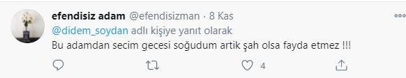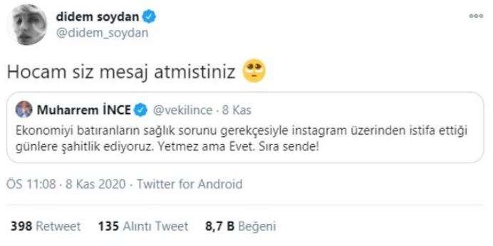 Didem soydan ise muharrem ince'ye ismail küçükkaya'ya seçim gecesi attığı "adam kazandı" mesajını hatırlattı. ünlü modelin "hocam siz mesaj atmıştınız" yorumu sosyal medyaya damga vurdu.