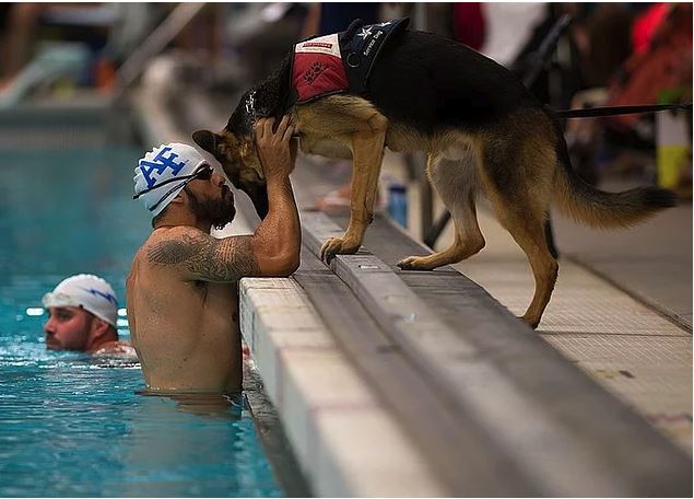 Hava kuvvetleri sporcu, august o’niell, savaş köpeği kai'yi, 2014 savaşçı oyunları'nın yüzme bölümünde ısınma sırasında öperken - 2014