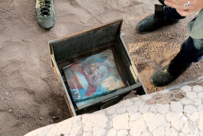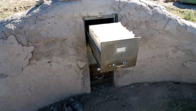 Bu yüzden derginin yetkilileri, kum torbalarıyla bir siper biçimini verdikleri alanın ortasına bu dolaplardan bir adet yerleştiriyor. dolabın en üst çekmecesine bir kütüphane kartı, bir kitap kataloğu, bir ziyaretçi defteri ve kitap okurken üzerine oturmak için bir minder koyuyorlar.