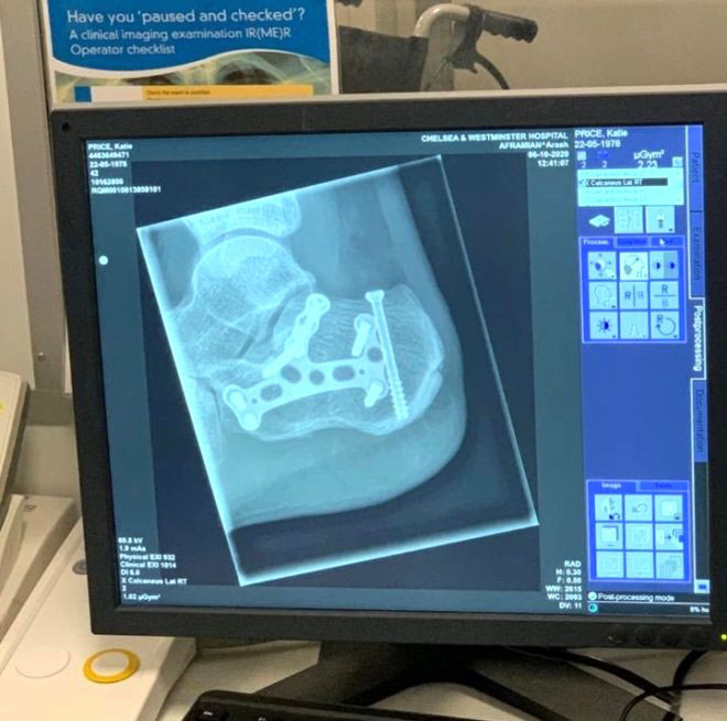 Kate Price, dikişli ayağının ve hastanede çekilen röntgen görüntülerinin fotoğrafı şu sözlerle paylaştı: Ayağımın kırılmadığını, ayağında şişik olduğunu ve bu şişikliği kırıkmış gibi gösterdiğim insanlara.