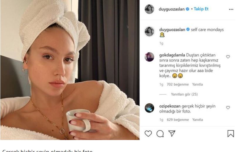 Özarslan son olarak sinem kobal ve serenay sarıkaya'da gördüğü kıyafetlerin aynısından alıp giymesiyle dikkat çekmişti. internet ünlüsü isim şimdi de bornozlu pozuyla dalga konusu oldu. duygu özaslan bornozuyla verdiği pozu paylaşınca takipçileri yorum yağdırdı.