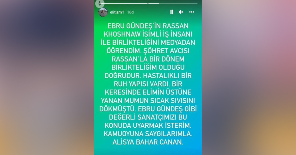 Şimdilerde Ebru Gündeş'le birlikte olan Iraklı iş insanı Rassan Khoshnaw ile geçmişte ilişki yaşayan Bahar Candan, sosyal medya hesabından yaptığı paylaşımla ünlü şarkıcıyı uyardı. Candan, hastalıklı bir ruh yapısı olduğunu iddia ettiği genç iş insanı için "Elimin üstüne yanan mumun sıvısını döktü" dedi.