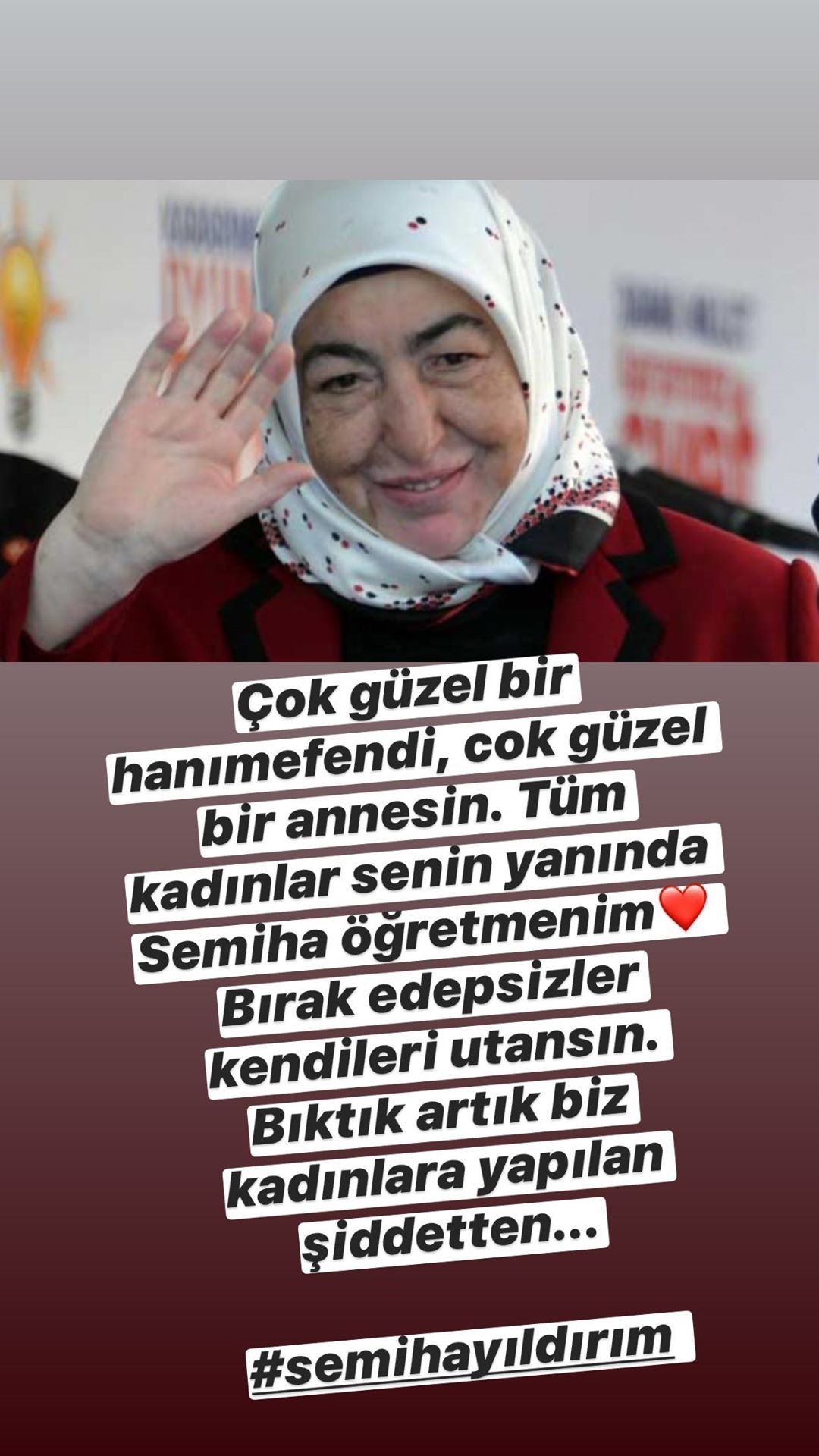 ‘çok güzel bir hanımefendi, çok güzel bir annesin. tüm kadınlar senin yanında semiha öğretmenim. bırak edepsizler kendileri utansın. bıktık artık biz kadınlara yapılan şiddetten…’
