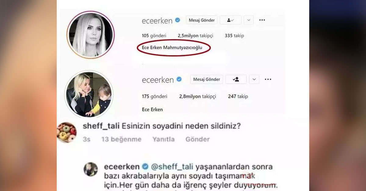 Son olarak ünlü sunucu Ece Erken soyadında bulunan Mahmutyazıcıoğlu'nu kaldırdı. Bir takipçisinin neden sorusuna ise şu cevabı verdi;