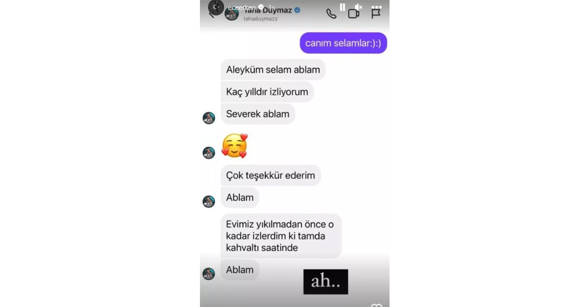 Taha Duymaz'ın vefatının ardından Instagram üzerinden kendisine attığı mesajları paylaşan Ece Erken duyduğu üzüntüyü dile getirdi. Taha'nın "Abla seni çok seviyorum. Keşke cevap versen" mesajına "Canım selamlar" diyerek karşılık verdiği ekran görüntüsünü paylaştı.