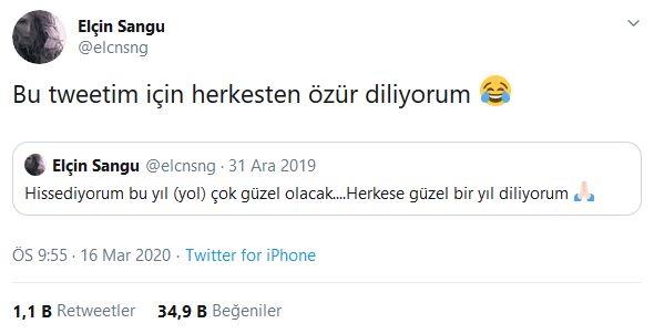 2020 ile ilgili iyi temennilerde bulunduğu tweetini alıntılayan elçin sangu, şu ifadeleri kullandı: “bu tweetim için herkesten özür diliyorum”