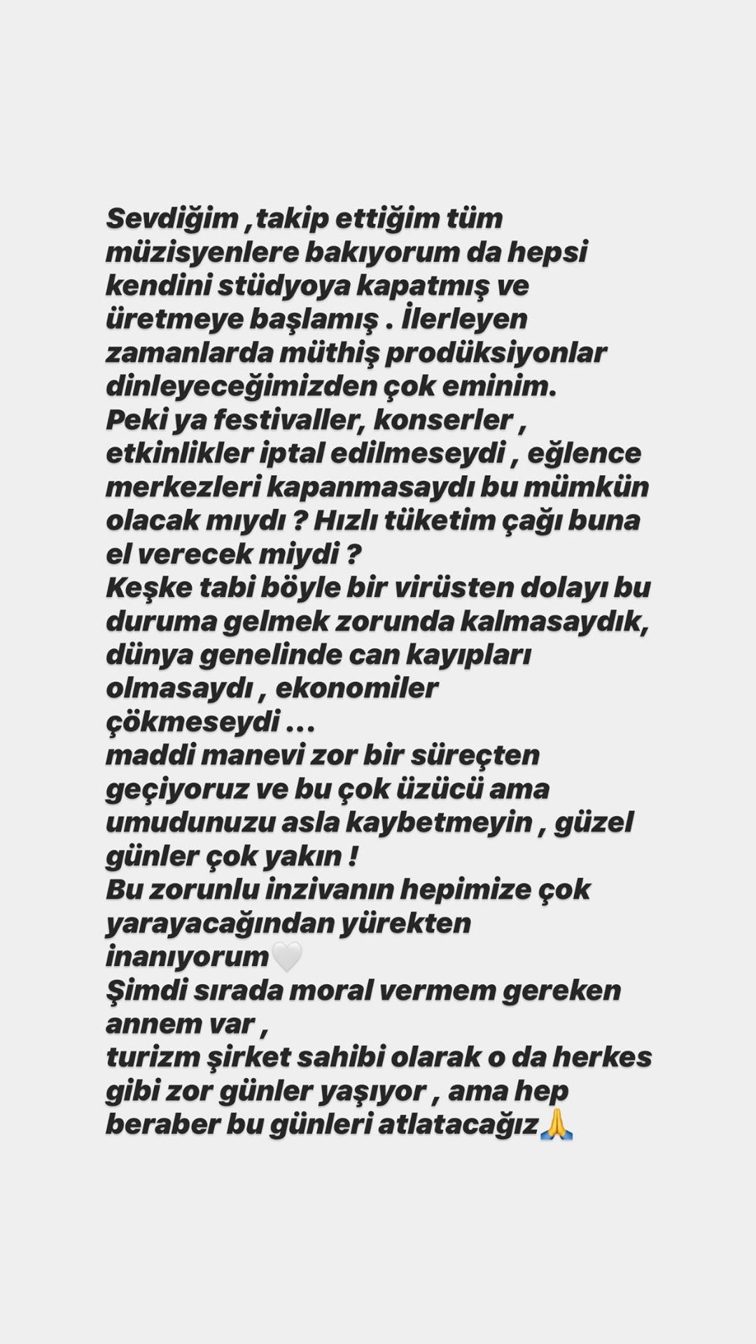 Şimdi sırada moral vermem gereken annem var, turizm şirket sahibi olarak o da herkes gibi zor günler yaşıyor ama hep beraber bu günleri atlatacağız”