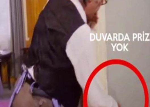 "Neşeli Günler" filminin bir sahnesinde Münir Özkul duvarda olmayan prize ütünün fişini takıyor.
