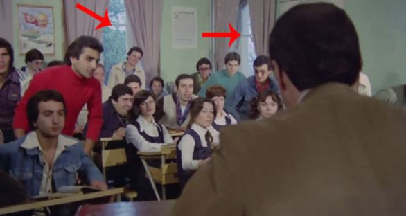 Hababam Sınıfı çekimlerinde kameraya yansıyan set ekibi.
