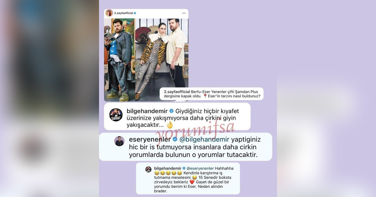 Çiftin pozlarını beğenmeyen Demir, "Giydiğiniz hiçbir kıyafet üzerine yakışmıyorsa daha çirkini giyin, yakışacaktır" şeklinde yorum yaptı. Bu yoruma cevapsız kalamayan Eser Yenenler, "Yaptığınız hiçbir iş tutmuyorsa insanlara daha çirkin yorumlarda bulunun, o yorumlar tutacaktır" Şeklinde karşılık verdi. Demir ise Yenenler'e "Kendinle karıştırma iş tutamama meselesini. 15 senedir boksta zirvedeyiz bekleriz. Gayet de güzel bir yorumdu benimki Eser. Neden alındın birader" dedi.