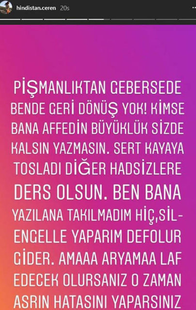 İşte hindistan'ın yaptığı söz konusu paylaşım: "pişmanlıktan gebersede bende geri dönüş yok! kimse bana affedin, büyüklük sizde kalsın yazmasın. sert kayaya tosladı. diğer hadsizlere ders olsun. ben aban yazılana takılmadım hiç sil-engelle yaparım defolur gider. ama aryama laf edecek olursanız o zaman asrın hatasını yaparsınız!"