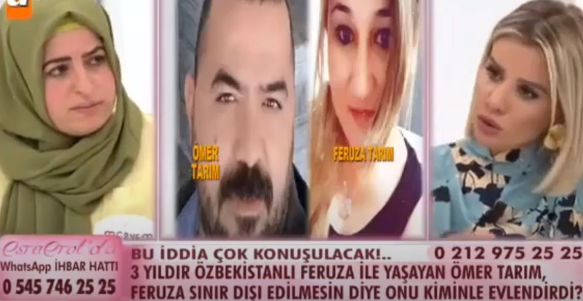 Kayınpederinin de eşi ve yabancı uyruklu sevgilisi gibi gazinoda çalıştığını söyleyen mağdur kadın canlı yayındaki sözlerine şöyle devam etti: 'kayınpederim de o evde onlarla yaşıyordu. sonra bunlar konya'dan denizli'ye kaçıp 5-6 ay orada kaldılar. bu esnada eşim ısrar etmeme rağmen benimle boşanmadı ve sevgilisi sınır dışı edilmesin diye öz babasına resmi nikah kıydırdı. yabancı uyruklu f.t.'nin resmi nikahı kayınpederimin üstünde dini nikahı ise eşi ömer tarım'ın üstünde. hatta kadın şu an eşimden 3 buçuk aylık hamile.'