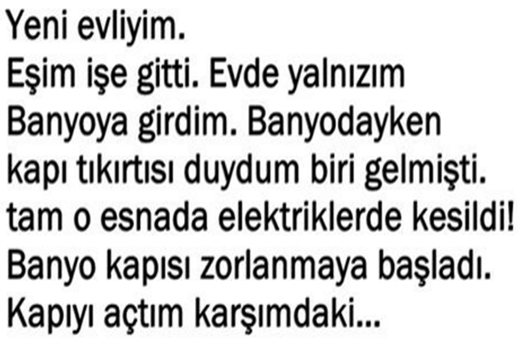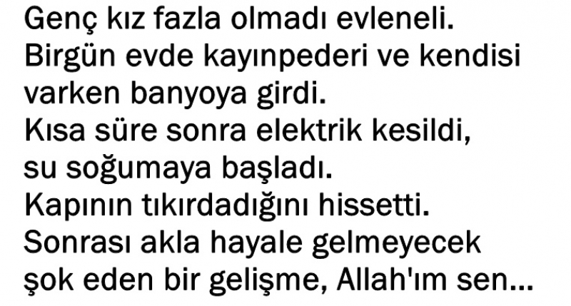 asıl soruyu olayın tamamını okuduktan sonra sormanızı istiyoruz. o. b. "olay günü kahvaltı ettik. kayınpederim kahveye, eşim t b. saat 15.00’te işe gitti. akşam üzerine evde kimse olmadığı sırada banyoya girdim. elektrik kesildi.