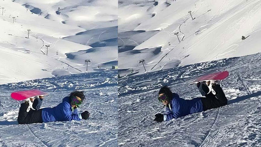 Yakın arkadaşlarıyla birlikte snowboard yapan ünlü şarkıcı, bembeyaz karlar üzerinde objektiflere poz verdi.