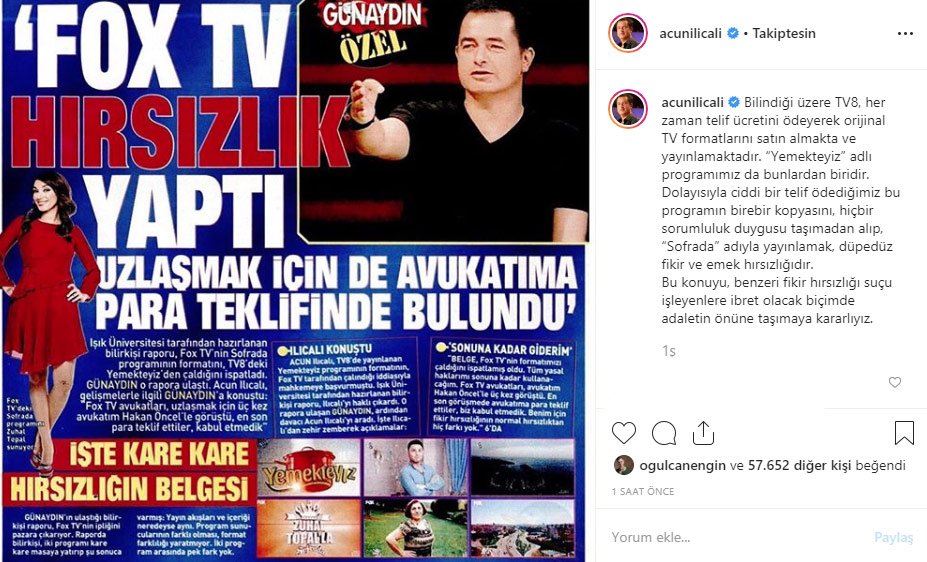 Ünlü televizyoncu Acun Ilıcalı, TV8'de yayınlanan Yemekteyiz formatının Fox TV'de yayınlanan Zuhal Topal'la Sofrada adlı program tarafından taklit edildiğini belirterek dava açmıştı. Işık Üniversitesi tarafından hazırlanan bilirkişi raporu; Acun Ilıcalı'nın haklı olduğunu ortaya koydu.