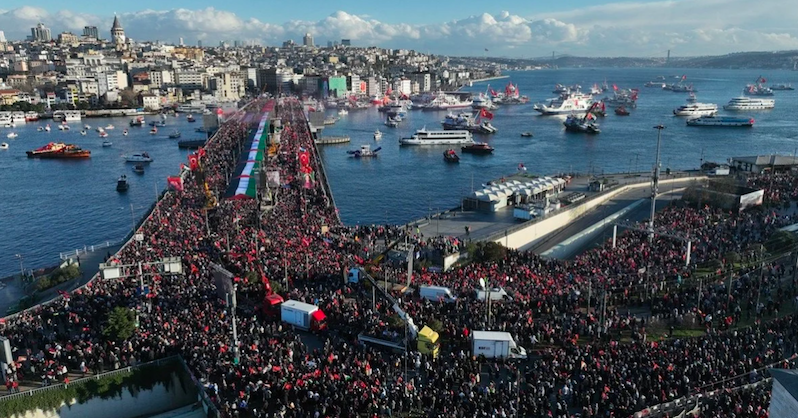 İstanbul Galata’da düzenlenen Filistin’e destek eylemine yüz binlerce kişi katıldı. Köprü boyunca toplanan kalabalık, Filistin bayrakları ve pankartlarla İsrail’in saldırılarını protesto etti. İstanbul’dan yükselen sloganlar, yalnızca Türkiye’ye değil tüm dünyaya mesaj verdi.