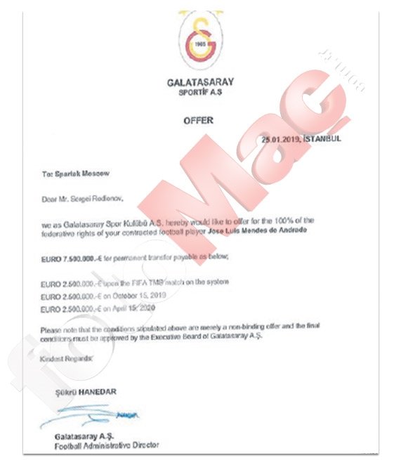 Şükrü hanedar'ın ıslak imzası ile rus ekibine gönderilen belgede sarı kırmızılıların yeşil burun adalı oyuncu için 7,5 milyon euroluk teklifte bulunduğu görülüyor. fotomaç