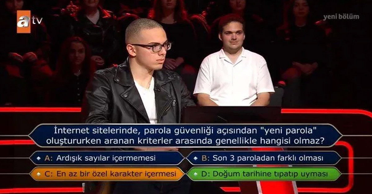 İkinci soruda yarışmacı, "İnternet sitelerinde, parola güvenliği açısından 'yeni parola' oluşturulurken aranan kriterler arasında genellikle hangisi olmaz?" sorusuyla karşılaştı.