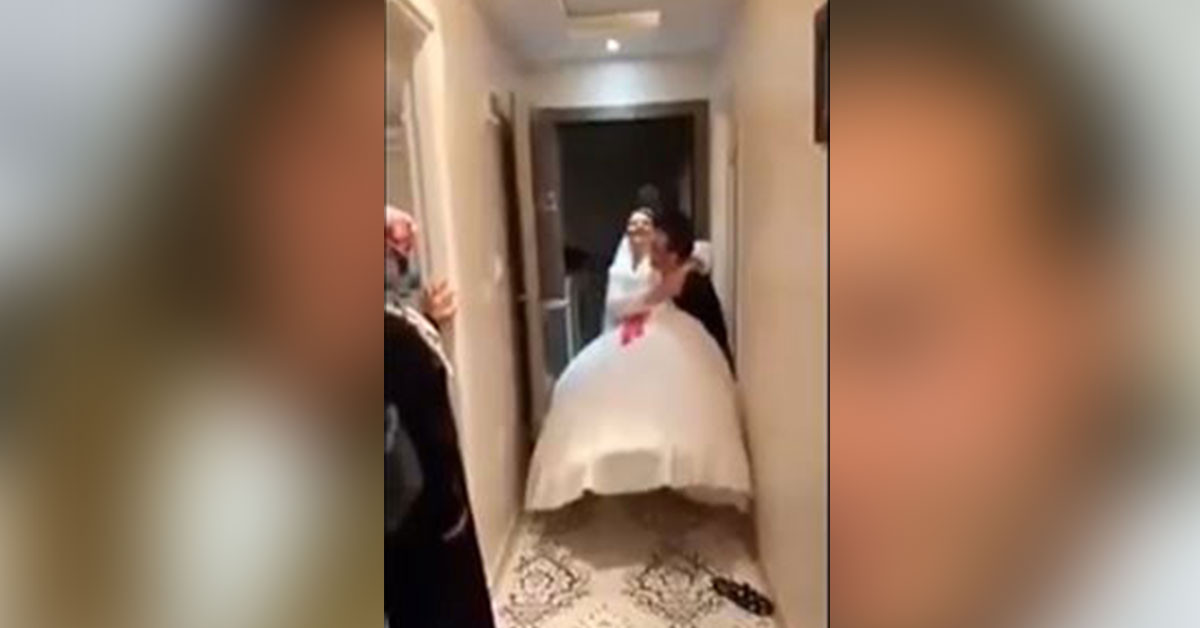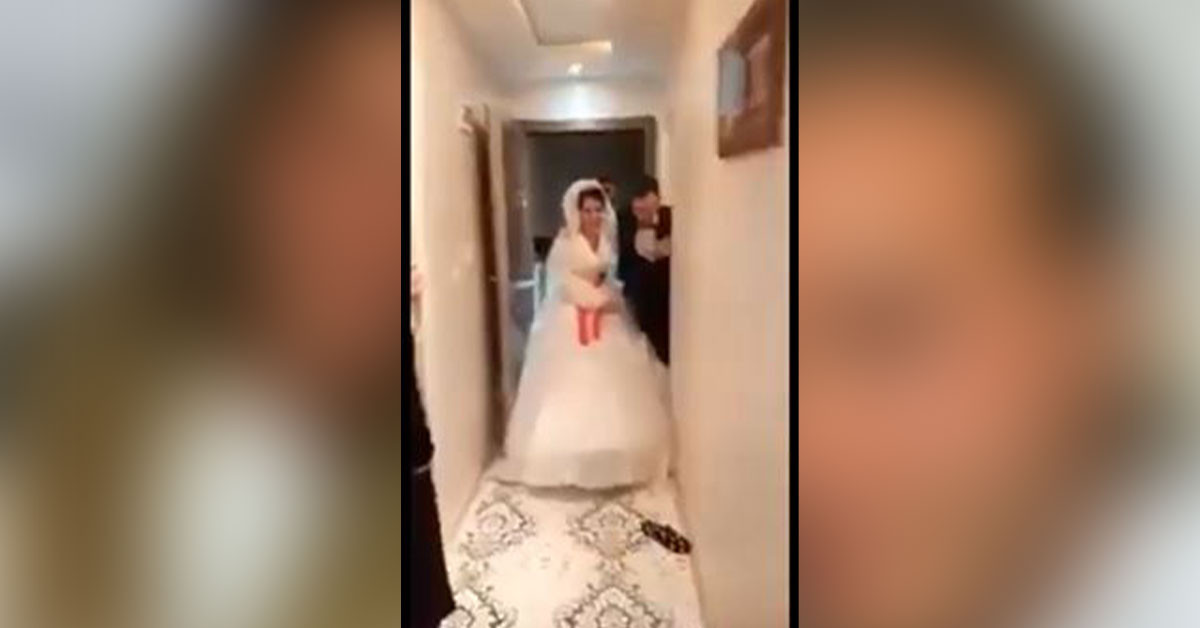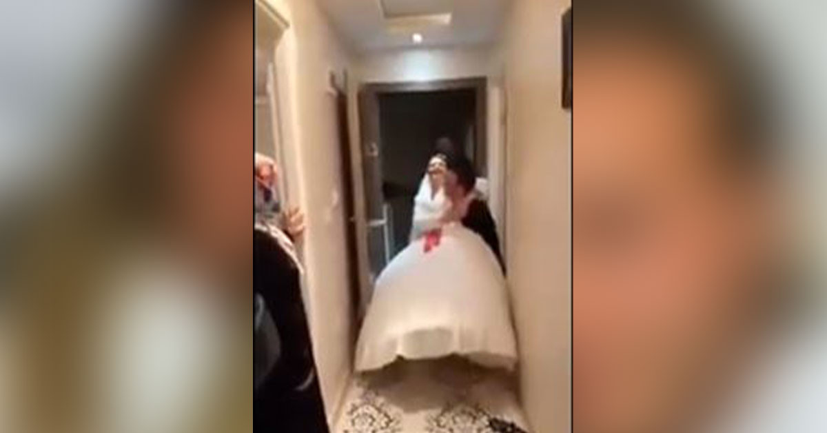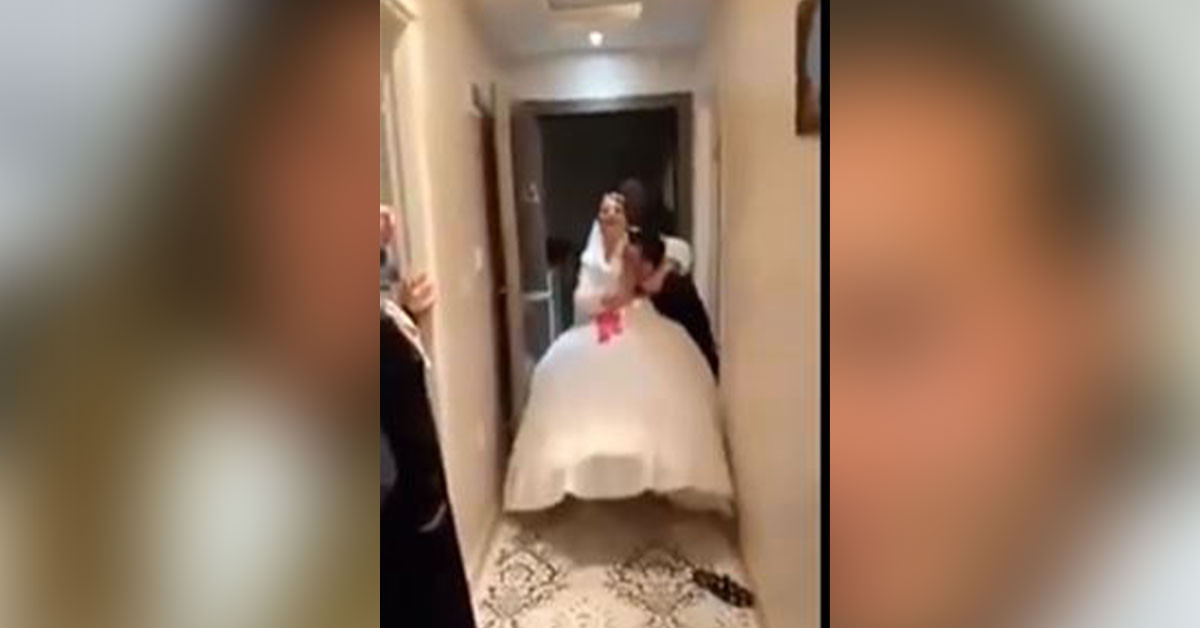Normalde gelin kucağında eşikten geçmesi gereken damat bunu içeri girdikten sonra yapmaya çalışıyor. Ancak gelinlikten midir güçsüzlükten mi bilinmez damat gelini kucağına bir türlü alamıyor. Duruma hemen farklı bir çözüm buluyorlar ve gelin damadı kucağına alıyor. Herkesin gülme krizine girdiği bu anlar sosyal medyaya yansıyınca ortaya komik bir durum çıktı.