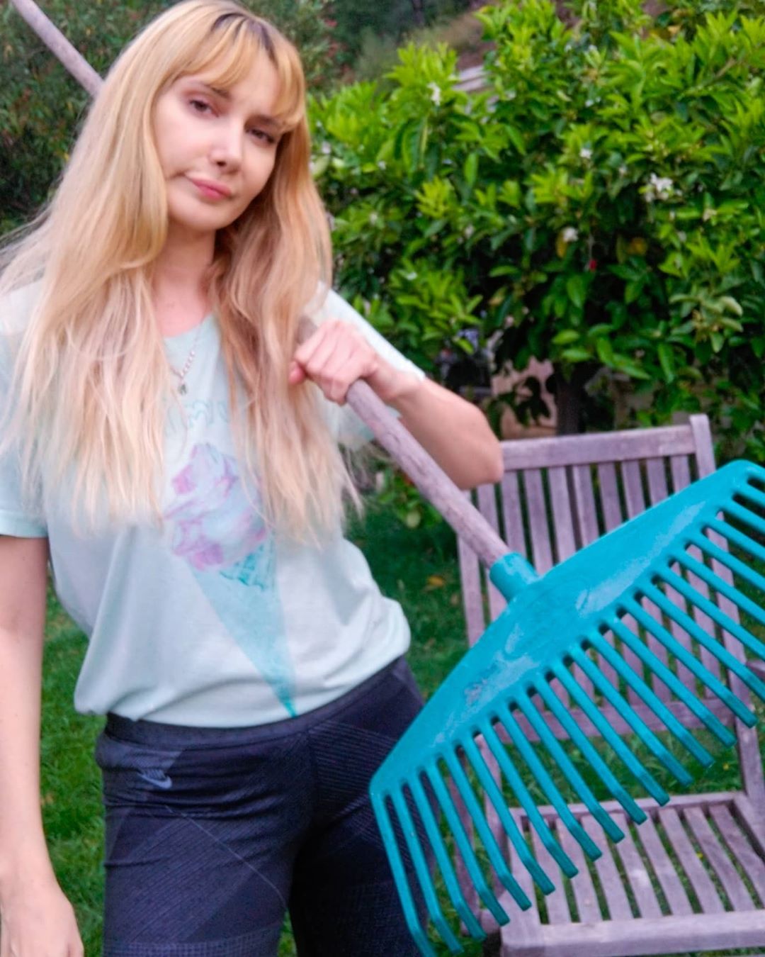 Gökçe, evinin bahçesini temizledikten sonra elindeki uzun saplı tırmıkla verdiği pozu ınstagram hesabında takipçilerinin beğenisine sundu.