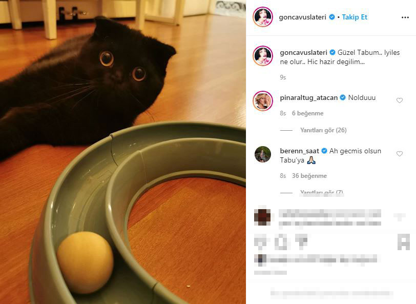 Ünlü oyuncu gonca vuslateri, paylaşımına “güzel tabum, iyileş ne olur, hiç hazır değilim” notunu ekleyerek kedisi tabu’ya seslendi.