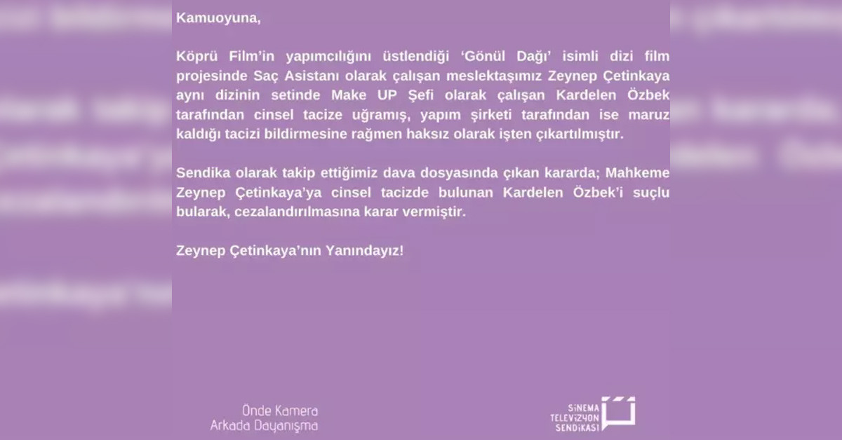 Sinema TV Sendikası yaptığı yazılı açıklamada “Köprü Film’in yapımcılığını üstlendiği ‘Gönül Dağı’ isimli dizi film projesinde Saç Asistanı olarak çalışan meslektaşımız Zeynep Çetinkaya (21) aynı dizinin setinde Make UP Şefi olarak çalışan Kardelen Özbek tarafından cinsel tacize uğramış, yapım şirketi tarafından ise maruz kaldığı tacizi bildirmesine rağmen haksız olarak işten çıkartılmıştır. Sendika olarak takip ettiğimiz dava dosyasında çıkan kararda; Mahkeme Zeynep Çetinkaya’ya cinsel tacizde bulunan Kardelen Özbek’i suçlu bularak, cezalandırılmasına karar vermiştir. Zeynep Çetinkaya’nın Yanındayız!”