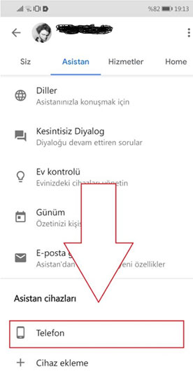 Daha sonra ekranı aşağı doğru kaydırın ve Asistan Cihazları başlığı altında bulunan Telefon seçeneğine girin.