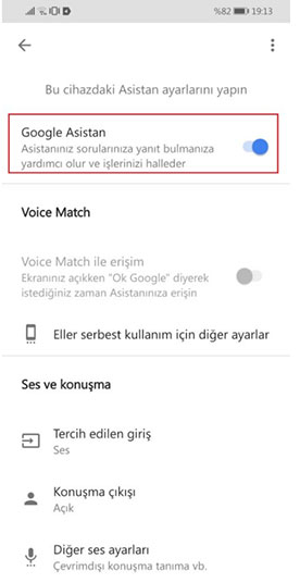 Gelen ekranda cihazınızdaki Google Asistan özelliğinin kapatmak için Google Asistan seçeneğinin yanındaki butonu devre dışı bırakın.