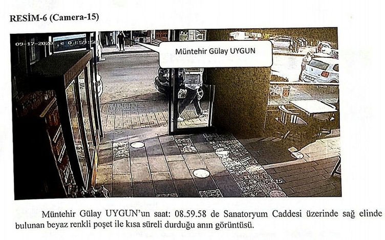 Polis tarafından hazırlanan fezlekede yer alan güvenlik kameralarına ilişkin görüntüler, Gülay Uygun'un ölü bulunduğu alana nasıl gittiğini ortaya çıkardı. Aleybey Sokak’ta bir iş yerinin kameralarına yansıyan Gülay Uygun, saat 08.59’da Sanatoryum Caddesi’nde başka bir kameranın açısına girdi.