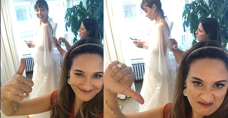 Esprili paylaşımıyla dikkat çeken ünlü oyuncu, paylaşımının altına "canım eltime gelinlik bakarken en samimi duygularımla destek olmuştum" notunu düştü.