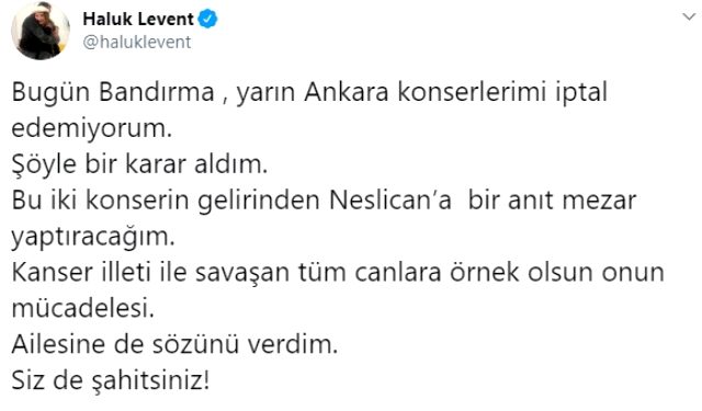 Haluk levent, dördüncü kez kansere yakalanan ve dün akşam hayata gözlerini yuman neslican tay için anıt yaptıracağını duyurdu.