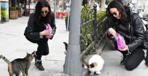 Nişantaşı’nda market alışverişine çıkan hande ataizi, aç kalan sokak hayvanları için mama almayı da ihmal etmedi. ataizi, sevimli dostları elleriyle besledi.