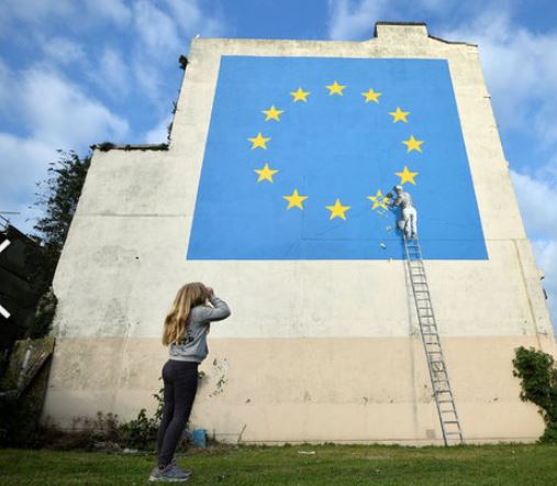 Duvar resminde bir işçi ab bayrağı'nda yer alan 12 yıldızdan birini parçalıyor.