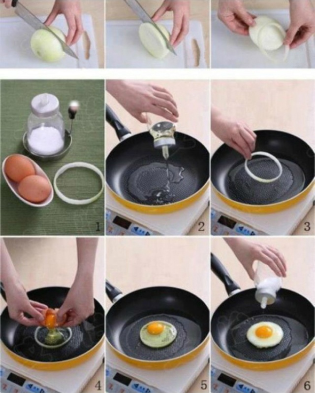 Herhangi bir özel alet veya alet almadan mükemmel bir şekilde kızarmış yumurta yapabilirsiniz - tek yapmanız gereken bir soğanı bir halka keserek içine yerleştirmektir.
