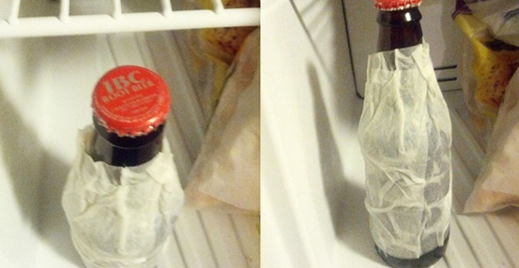 Bir içeceği hızlı bir şekilde soğutmak için nemli bir kağıt havluya sarın ve buzdolabına koyun. sadece 15 dakika içinde güzel ve serin olacak!