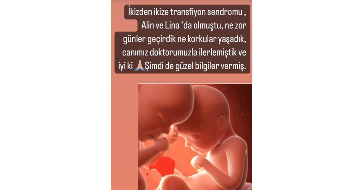 Güzel oyuncu paylaşımında, ‘İkizden ikize transfiyon sendromu, Alin ve Lİna’da olmuştu. Ne zor günler geçirdik, ne korkular yaşadık, canımız doktorumuzla ilerlemiştik iyi ki. Şimdi ne güzel bilgiler paylaşmış’ ifadelerini kullandı.