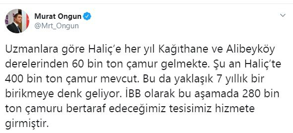 İstanbul büyükşehir belediyesi sözcüsü murat ongun da yalanlar kervanına katılan isim oldu. haliç'e 7 yıldır çamur akıyor diyen ongun, ''uzmanlara göre haliç’e her yıl kağıthane ve alibeyköy derelerinden 60 bin ton çamur gelmekte. şu an haliç’te 400 bin ton çamur mevcut. bu da yaklaşık 7 yıllık bir birikmeye denk geliyor. ibb olarak bu aşamada 280 bin ton çamuru bertaraf edeceğimiz tesisimiz hizmete girmiştir.'' ifadelerini kullandı.