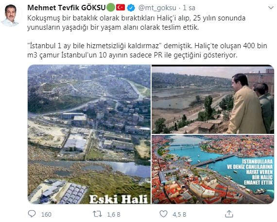 İmamoğlu'na cevap ibb ak parti grup başkanvekili ve esenler belediye başkanı mehmet tevfik göksu'dan geldi. göksu, sosyal medya hesabından yaptığı açıklamada şu ifadeleri kullandı: "kokuşmuş bir bataklık olarak bıraktıkları haliç'i alıp, 25 yılın sonunda yunusların yaşadığı bir yaşam alanı olarak teslim ettik. 'istanbul 1 ay bile hizmetsizliği kaldırmaz' demiştik. haliç'te oluşan 400 bin m3 çamur istanbul'un 10 ayının sadece pr ile geçtiğini gösteriyor."