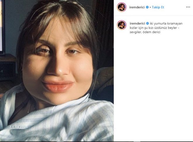 Instagram hesabında yüzünü photoshop ile büyüttüğü bir fotoğrafını yayınlayan irem derici, paylaşımının altına şu notu düştü: “iki yumurta kıramayan kızlar için şu kızı üzdünüz beyler. sevgiler, ödem derici”