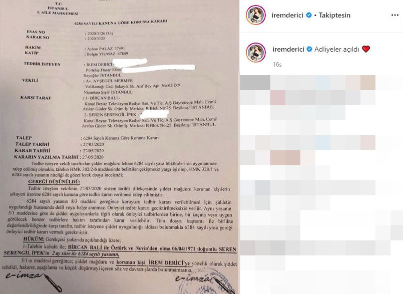 Seren serengil ve bircan bali’den şikayetçi olan irem derici, yaptığı suç duyurusunu sosyal medya hesabında yayınlamayı da ihmal etmedi.