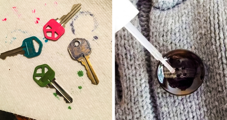 Oje: yapıştırıcı olmadığında zarfların kapatılmasına yardımcı olabilir. ipliği sertleştirmeye yardımcı olabilir, iğnelerin içinden daha kolay geçmesini sağlar. ipliklerin düğmelerinizde çözülmemesi için basit bir yapıştırıcı olarak kullanılabilir. ve renkli tırnak cilası, anahtarlarınızı renklendirmek için kullanılabilir ve bu da onları daha iyi tanımlamanıza yardımcı olur.