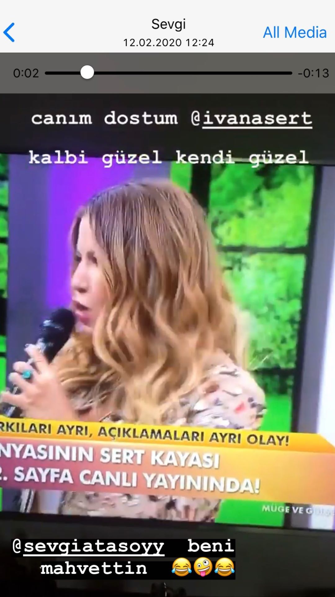 Bir magazin programına konuk olan ıvana sert, televizyon ekranından çekilen fotoğrafını ınstagram’ın hikaye kısmında paylaştı.