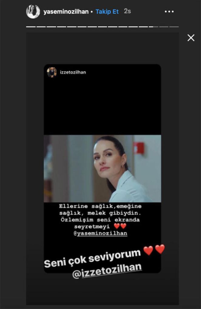 Eşini izlerken çektiği kareyi ınstagram hesabında yayınlayan izzet özilhan, paylaşımının altına şu notu düştü: "ellerine sağlık,emeğine sağlık, melek gibiydin. özlemişim seni ekranda seyretmeyi"