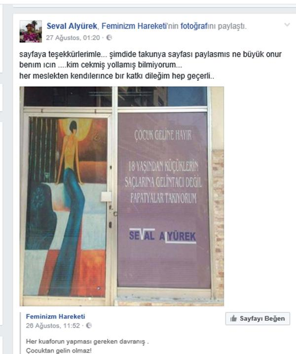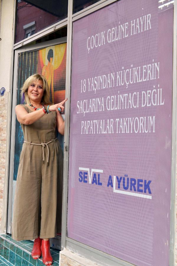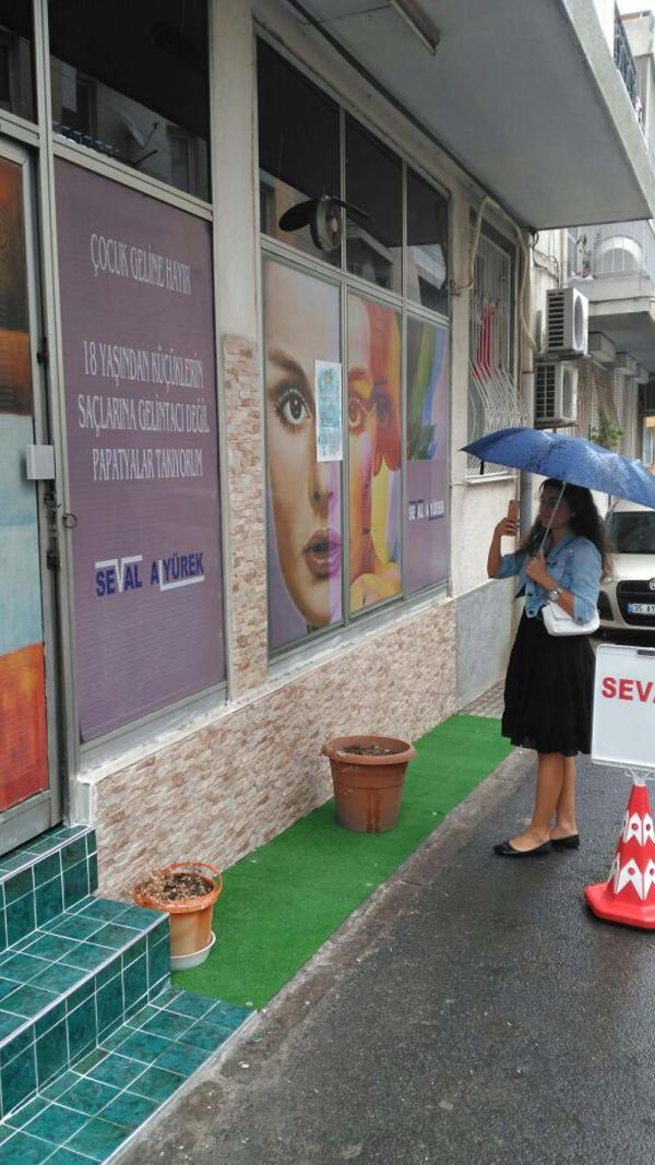 İzmir'de kuaför salonu bulunan seval alyürek, iş yerinin camına astığı "çocuk geline hayır! 18 yaşından küçüklere gelin tacı değil, papatya takıyorum" yazısıyla gösterdi. alyürek, bu yazının önünde çektirdiği fotoğrafı sosyal medyadaki hesabında paylaştı.