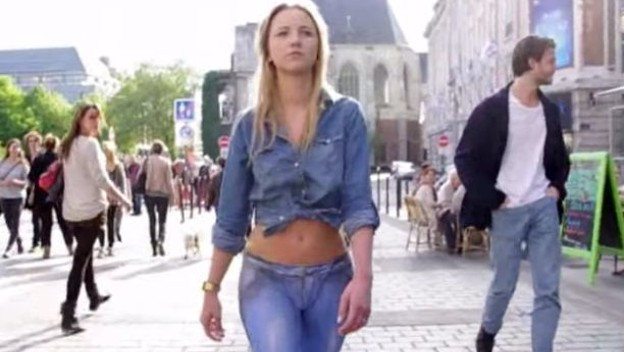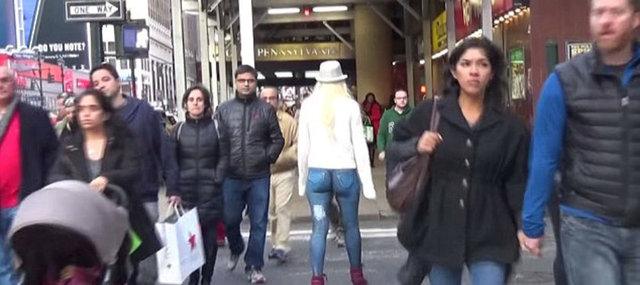 vücut boyama sanatçıları tarafından üzerinde pantolon varmış gibi boyanan genç kadın, sokağa iç çamaşırıyla çıktı ama kimse onu fark etmedi.