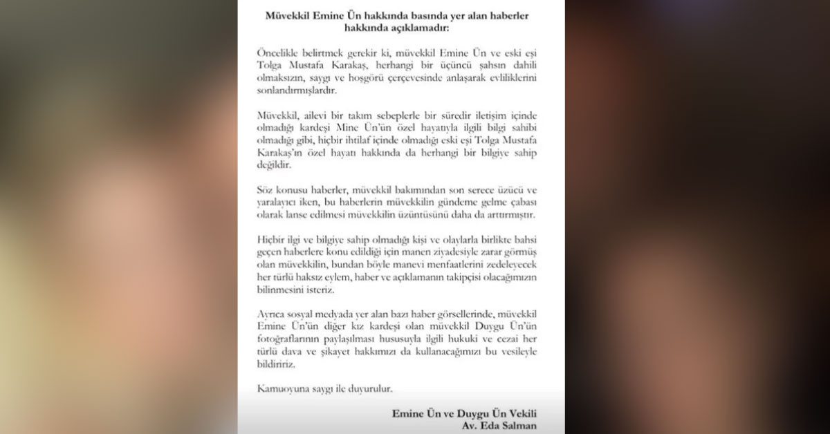 Yapılan açıklamada kesin bir şey söylenmezken Emine Ün'ün kardeşi ile görüşmediği söylendi ve şunlar ifade edildi; Müvekkil, ailevi bir takım sebeplerle bir süredir iletişim içinde olmadığı kardeşi Mine Ün'ün özel hayatıyla ilgili bilgi sahibi olmadığı gibi, hiçbir ihtilaf içinde olmadığı eski eşi Tolga Mustafa Karakaş'ın özel hayatı hakkında da herhangi bir bilgiye sahip değildir."