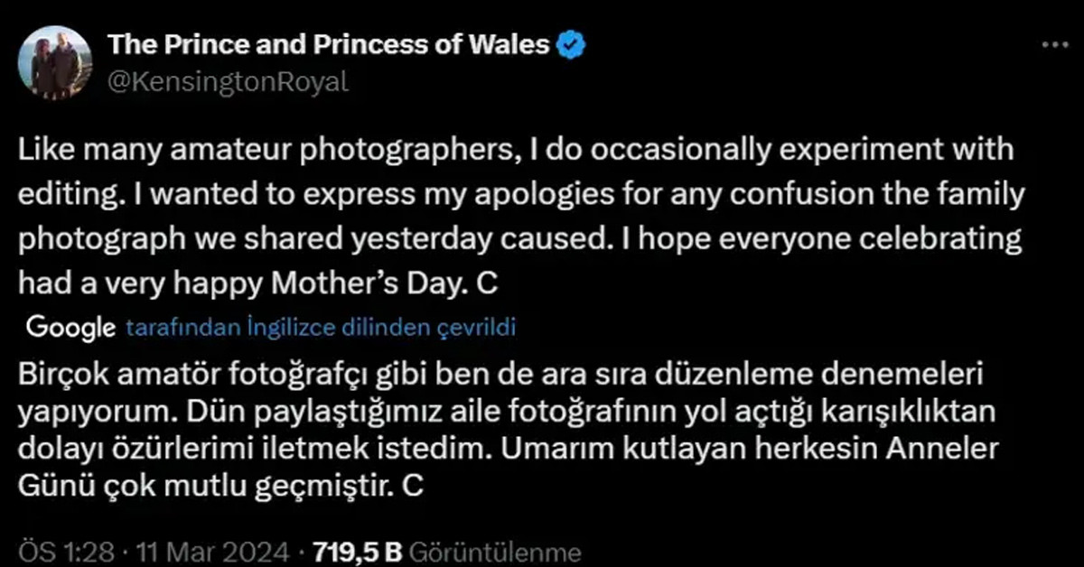 Kate Middleton’ın sağ ve sağlıklı olduğuna kanıt olması istenen fotoğraf üzerinde oynama yapıldığı için hatta kimlerine göre yapay zeka tarafından üretildiği düşünüldüğü için bunun da bir yalan olduğu söylentisi hızla yayıldı. Hastalığı ve ameliyatın gerekçesini açıklamak ve soru işaretlerini ortadan kaldırmak yerine sürekli farklı yöntemler deneyen kraliyet bir kez daha baltayı taşa vurmuş oldu. Sabahtan beri yaşanan bu krize dur demek bu kez de Kate Middleton’a düştü. Resmi hesaptan bir kez daha tweet atıldı ve Kate Middleton’ın ağzından “Birçok amatör fotoğrafçı gibi ben de ara sıra düzenleme denemeleri yapıyorum. Dün paylaştığımız aile fotoğrafının yol açtığı karışıklıktan dolayı özürlerimi iletmek istedim. Umarım kutlayan herkesin Anneler Günü çok mutlu geçmiştir. C” açıklaması yapıldı.