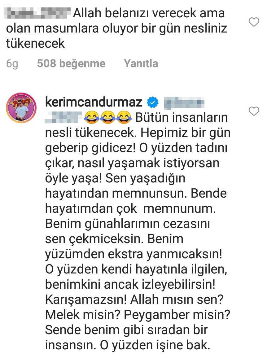 Sosyal medya fenomeni kerimcan durmaz ise takipçisinin yorumuna kayıtsız kalamadı. durmaz, söz konusu yoruma şöyle karşılık verdi: ‘bütün insanların nesli tükenecek. hepimiz bir gün geberip gideceğiz!’