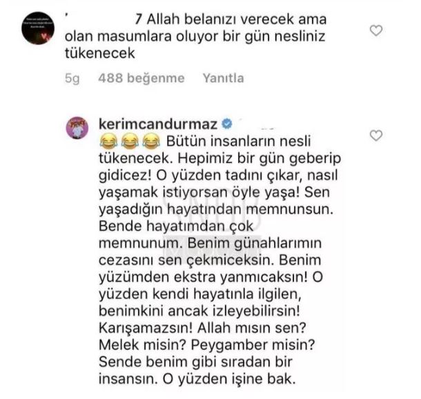 Durmaz, bu yorum sonrası çılgına döndü. takipçisine sert çıkan durmaz, "bütün insanların nesli tükenecek. hepimiz bir gün geberip gideceğiz! o yüzden tadını çıkar, nasıl yaşamak istiyorsan öyle yaşa! sen yaşadığın hayatından memnunsun. ben de hayatımdan çok memnunum. benim günahlarımın cezasını sen çekmeyeceksin. benim yüzümden ekstra yanmayacaksın! o yüzden kendi hayatınla ilgilen, benimkini ancak izleyebilirsin! karışamazsın! allah mısın sen? melek misin? peygamber misin? sende benim gibi sıradan bir insansın. o yüzden işine bak" dedi.