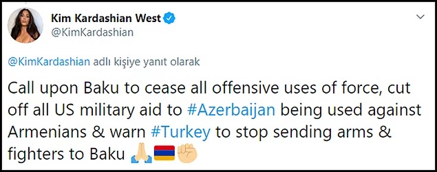 Mesela; Kim Kardashıan resmi Twitter hesabından bu tweeti paylaştı dün. Burada: '"Bakü'ye saldırgan güç kullanımını durdurması için çağrı yapılmalı, Azerbaycan'a ABD askeri yardımı durmalı. Türkiye, Bakü'ye silah ve savaşçı göndermemesi için uyarılmalı" yazıyor.